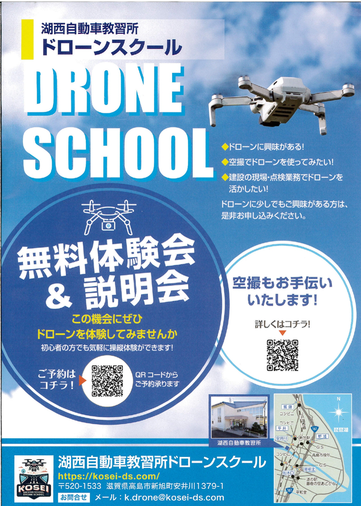 ドローンは近年急速に普及しており、映像・土木・建設・農業・物流など様々な分野で活躍が期待されています。湖西自動車教習所では、今まで培ってきた安全運転者育成のノウハウを活かし、安全なドローン操縦技術や知識を学んでいただきたく、 国土交通省登録講習機関「湖西自動車教習所ドローンスクール」として開講しました。